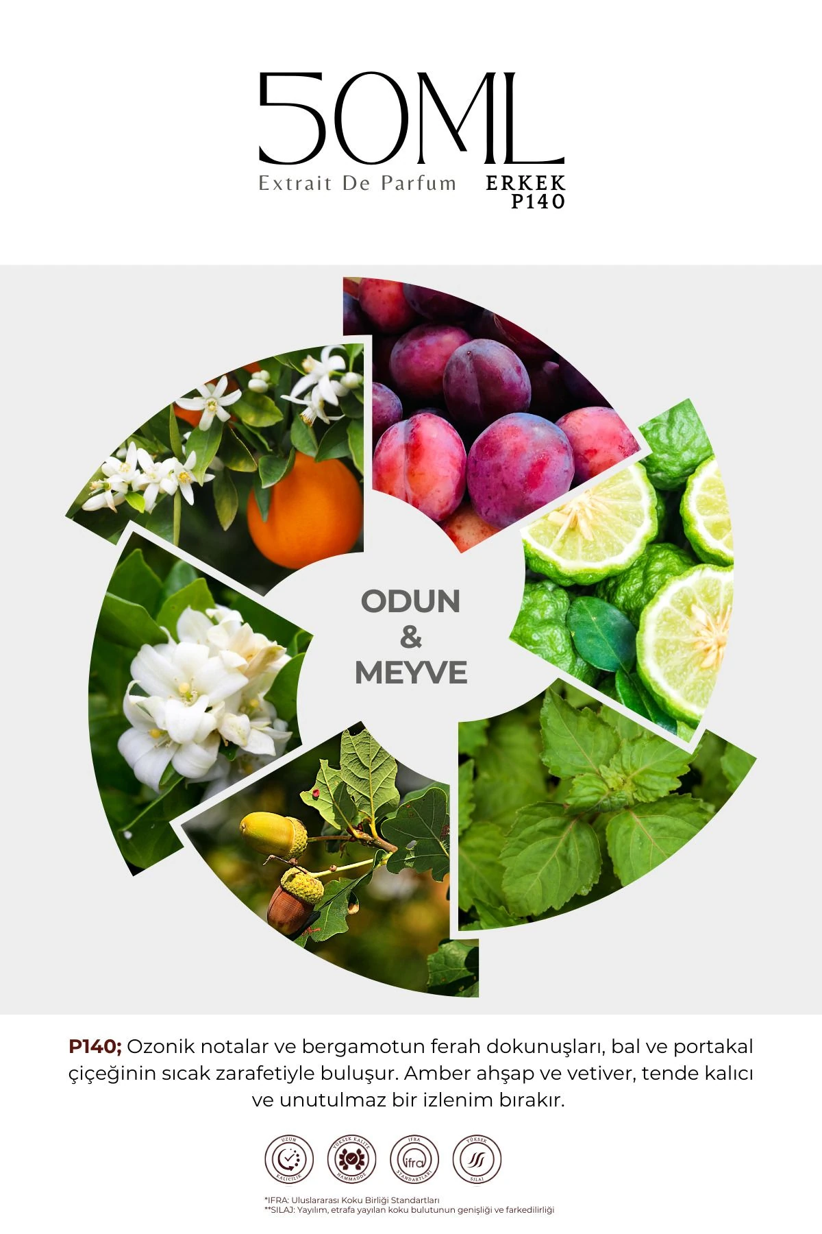 BE Parfum P Serisi P-140 Kodlu Edp Erkek Parfüm 50 mlFerah bir başlangıç, derin ve etkileyici bir son.Üst Notalar: Ozonik Notalar, Erik, Bergamot, GreyfurtOrta Notalar: Portakal Çiçeği, Bal, Yasemin, Kaşmir Ahşap, Sedir, FındıkAlt Notalar: Amber Ahşap, Vetiver, Paçuli (Silhat), Oakmoss (Meşe Liken)Ozonik notalar ve bergamotun ferah dokunuşları, bal ve portakal çiçeğinin sıcak zarafetiyle buluşur. Amber ahşap ve vetiver, tende kalıcı ve unutulmaz bir izlenim bırakır. Günlük kullanıma uygun, sofistike bir tercih.